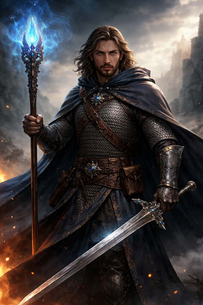 Now he serves as a wandering war instructor and crisis-solver, hired when conventional troops are outmatched. His staff is etched with containment runes and carries a bound shard of storm-crystal—meant for defense first, destruction second. The sword isn’t ceremonial either; it’s the reminder that when magic falters, the job still needs doing.